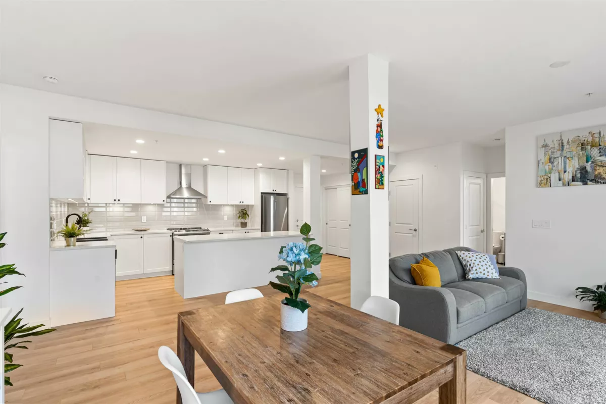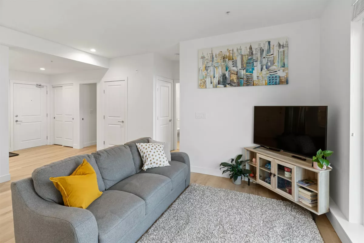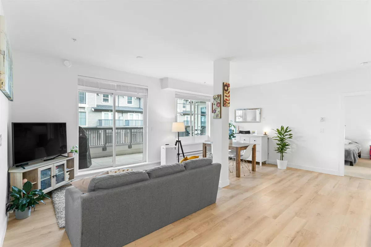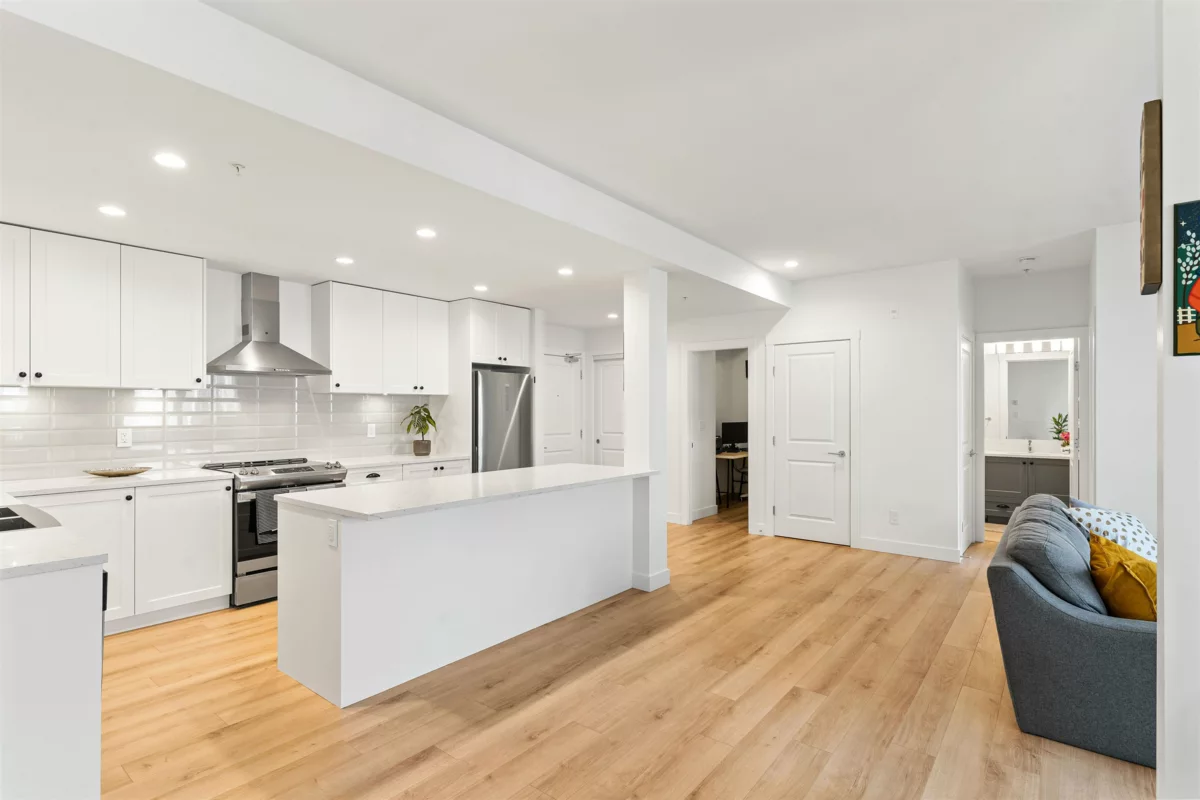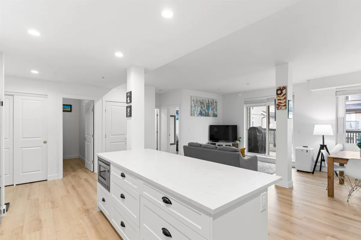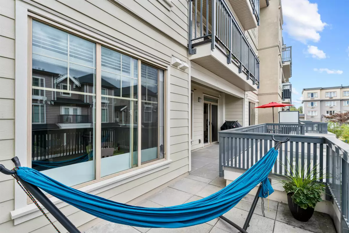 Welcome to Township Commons conveniently located within walking distance of all Langley has to offer. This 1244 sq ft two bedroom + den condo competes with the size of some townhomes with the advantage of one-floor living. Open concept main living area with a modern designer kitchen features an oversized island, classic shaker cabinets and quartz countertops. The massive master bedroom is large enough to have a sitting area or a second bed! The ensuite boasts a shower and tub and double sinks with plenty of elbow room. 311 sq ft of outdoor space gives plenty of room for big families!