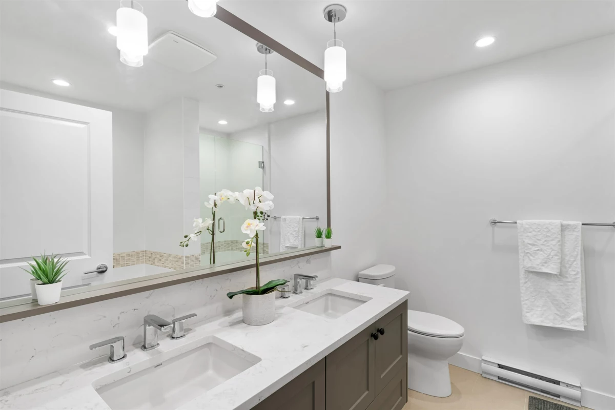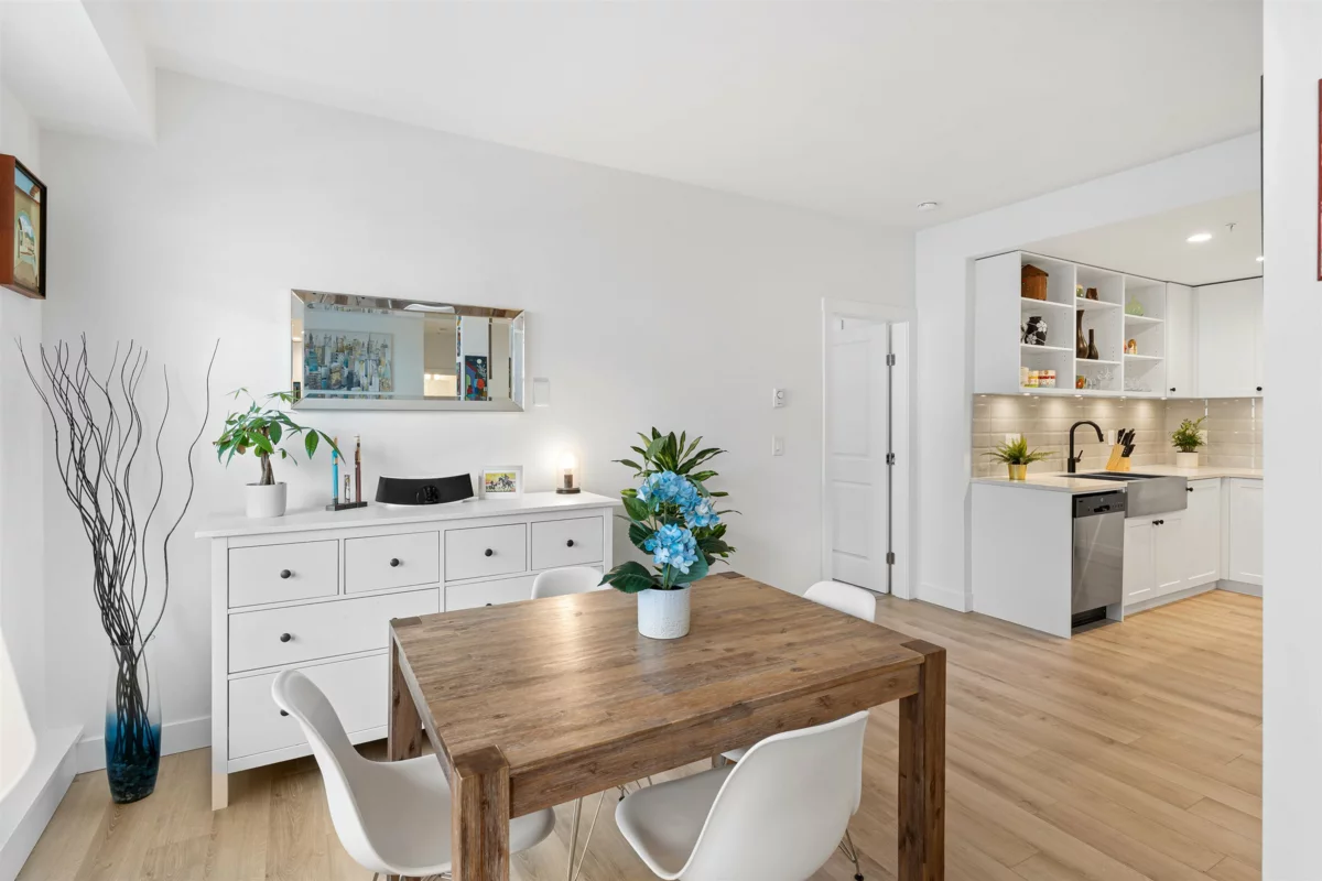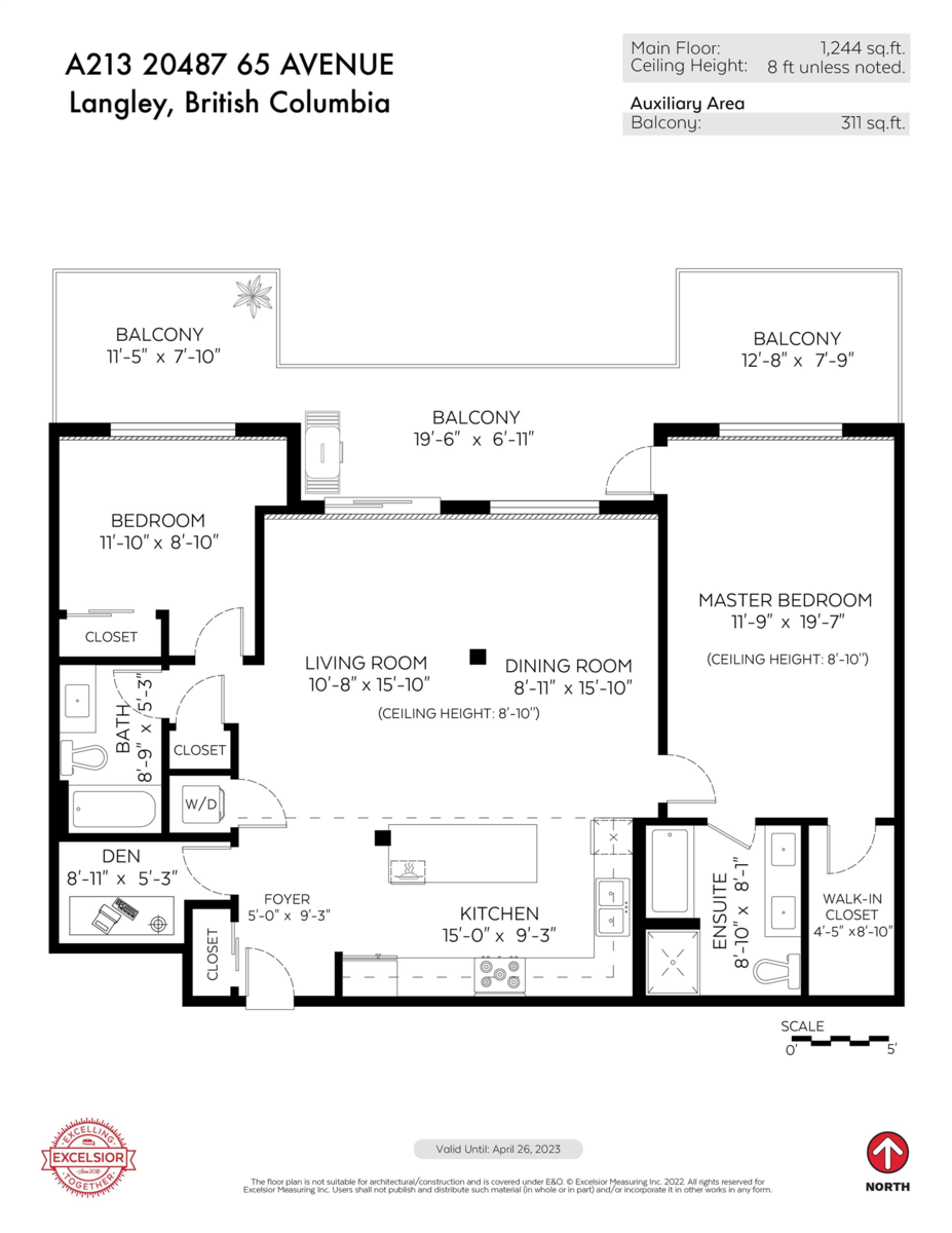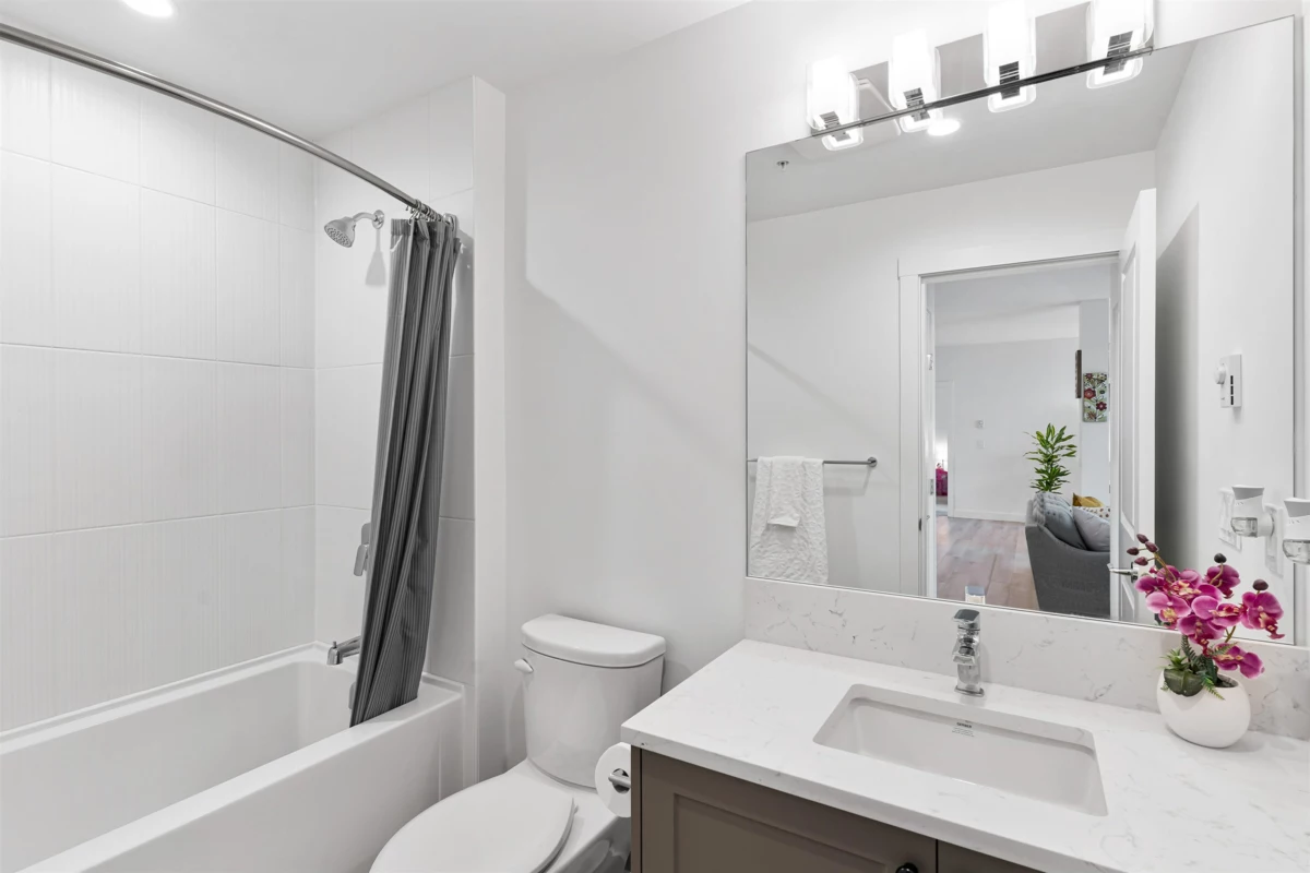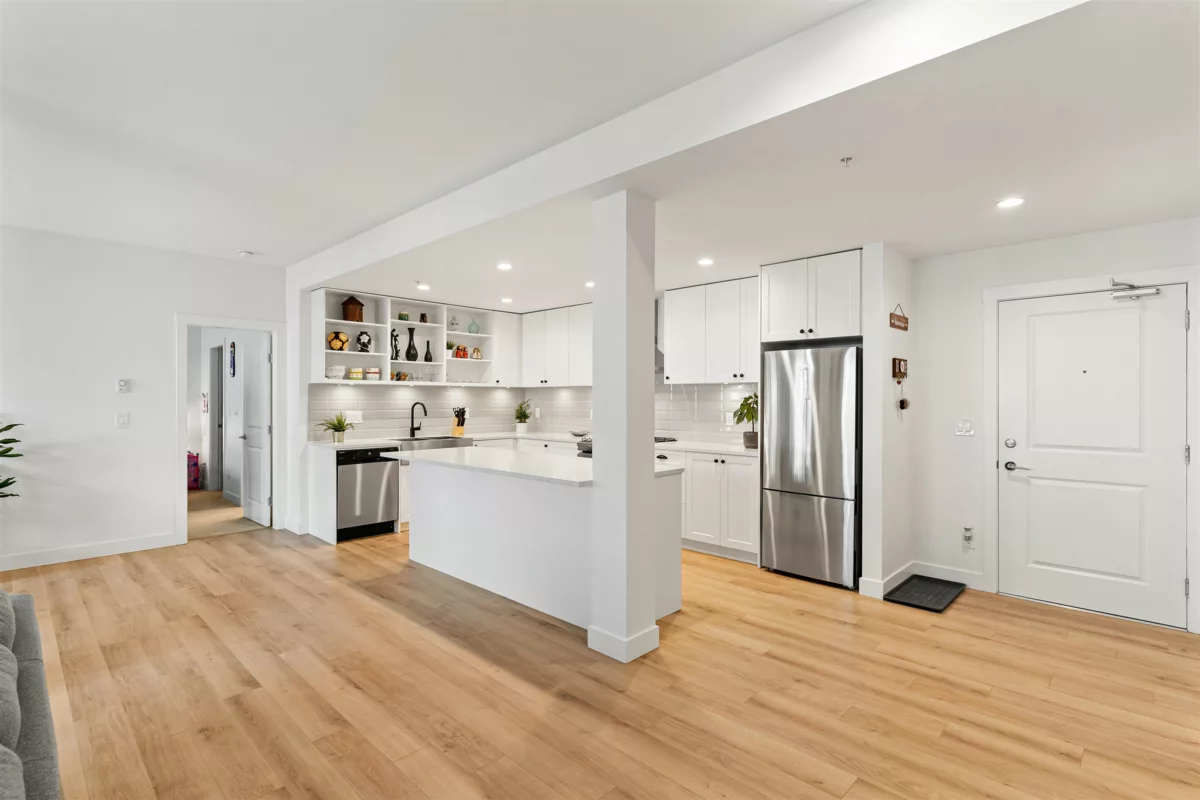 Welcome to Township Commons conveniently located within walking distance of all Langley has to offer. This 1244 sq ft two bedroom + den condo competes with the size of some townhomes with the advantage of one-floor living. Open concept main living area with a modern designer kitchen features an oversized island, classic shaker cabinets and quartz countertops. The massive master bedroom is large enough to have a sitting area or a second bed! The ensuite boasts a shower and tub and double sinks with plenty of elbow room. 311 sq ft of outdoor space gives plenty of room for big families!