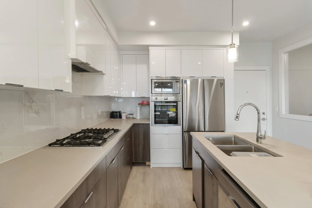 Welcome to AMSON SQUARE, situated in the vibrant heart of East Newton. This 2-bedroom, 1-bathroom unit offers 687 sq ft. + balcony, crafted for modern living. The open-concept layout features 9 ft ceilings, pot lights, and an energy-efficient air conditioning. Enjoy laminate flooring in the living/dining areas, cozy carpet in the bedroom, and sleek zebra window coverings. The kitchen boasts a waterfall island, quartz countertops, premium stainless steel appliances, and a gas stove. Outdoor amenities include a rooftop patio with a BBQ area, a party hall, and a kids’ play area with stunning mountain views. Local shops are right on the main floor of the building, bus stop is right in front of the building. A few minutes away from Newton Exchange, grocery stores, and restaurants.