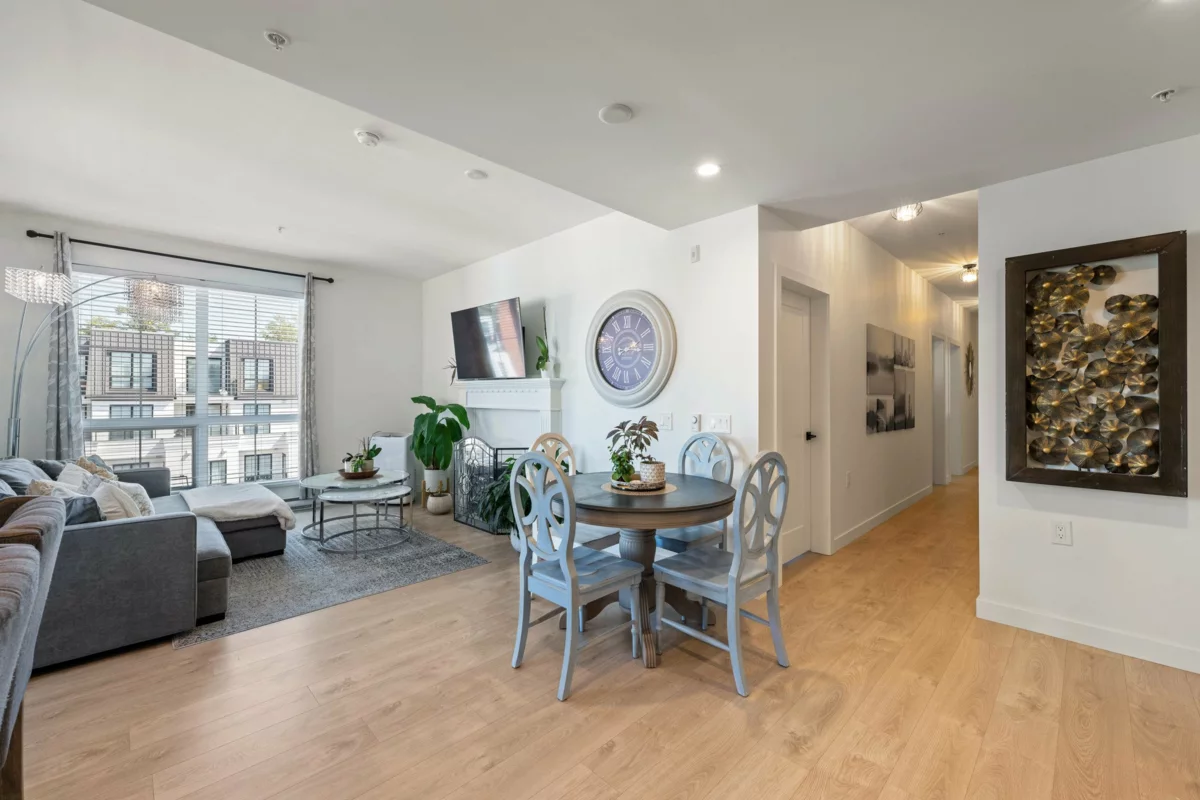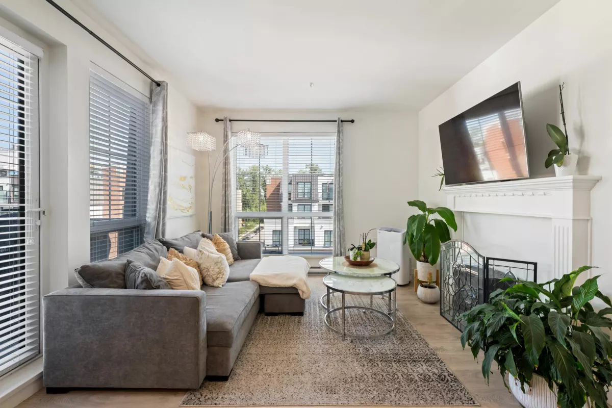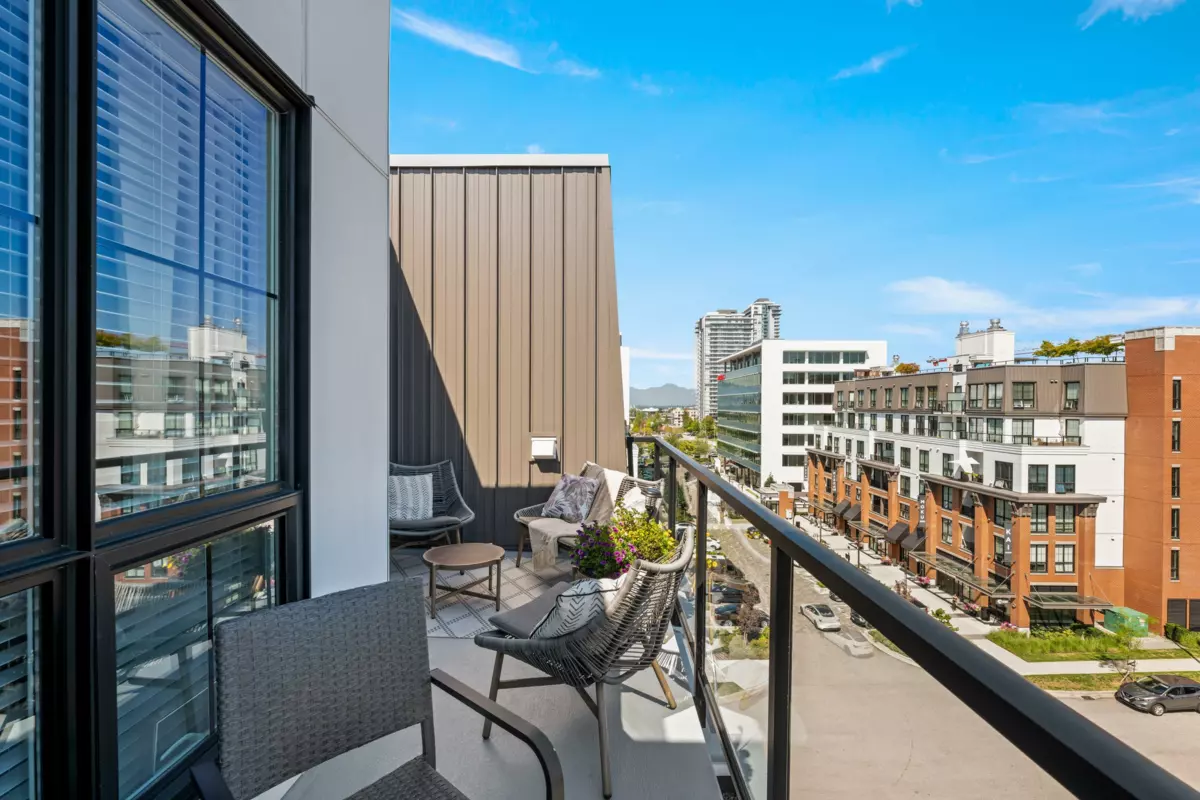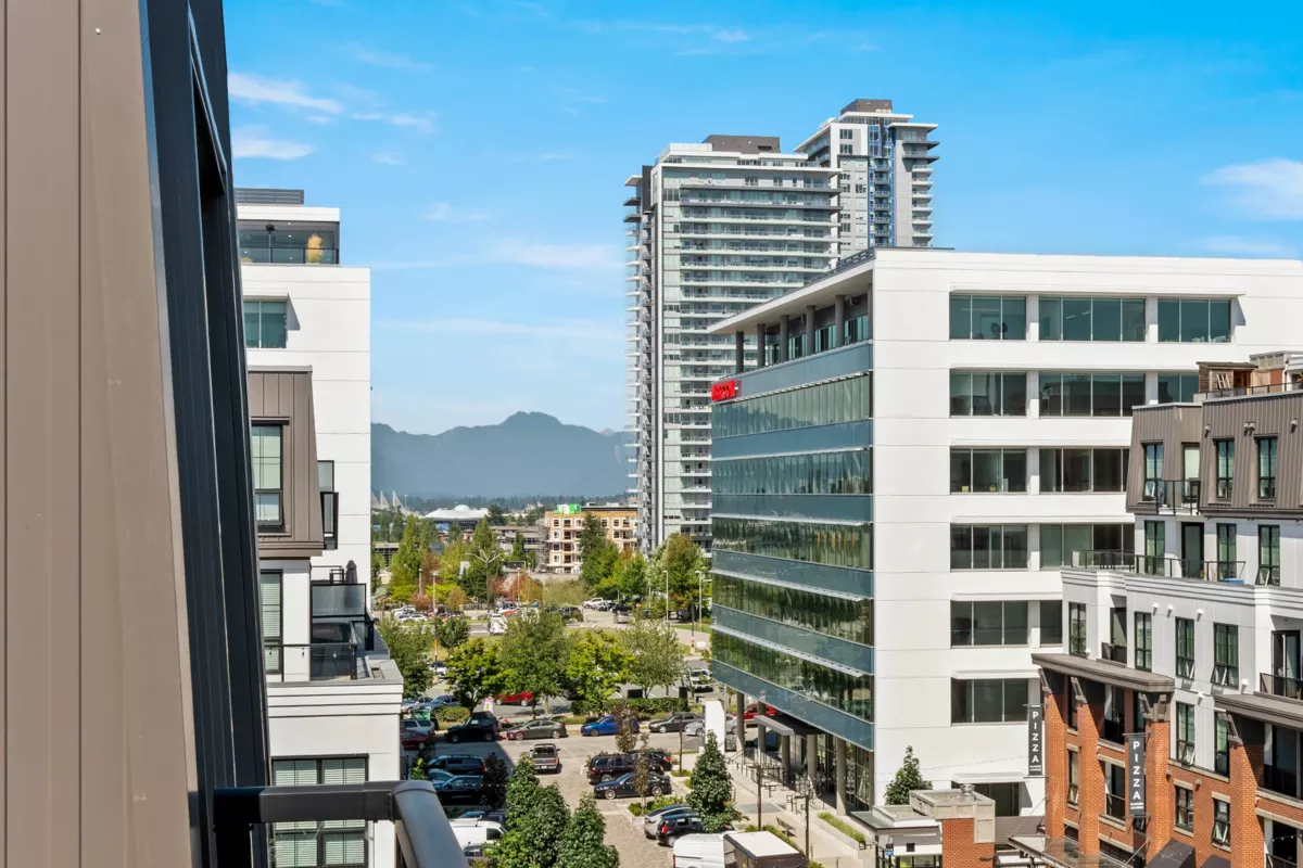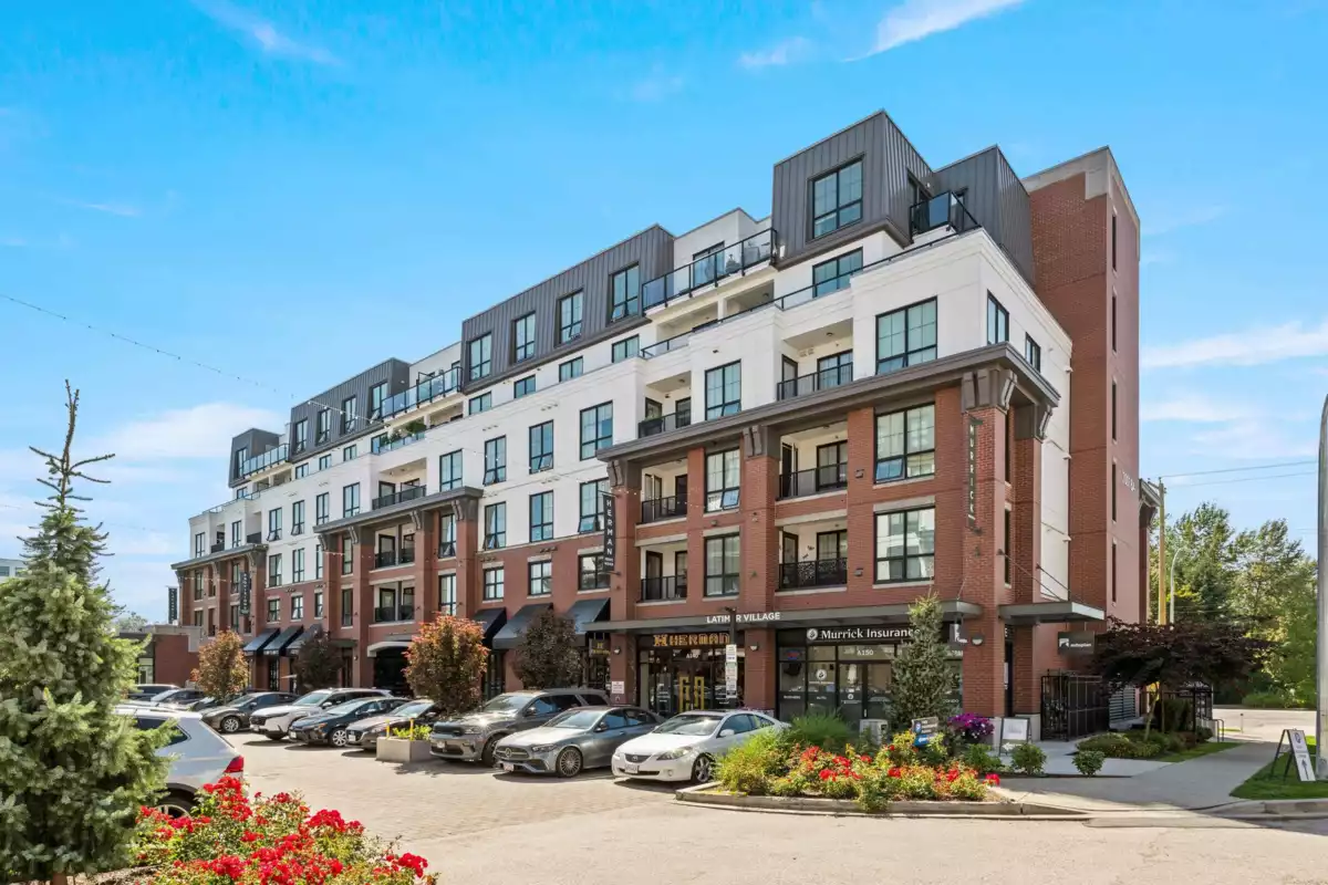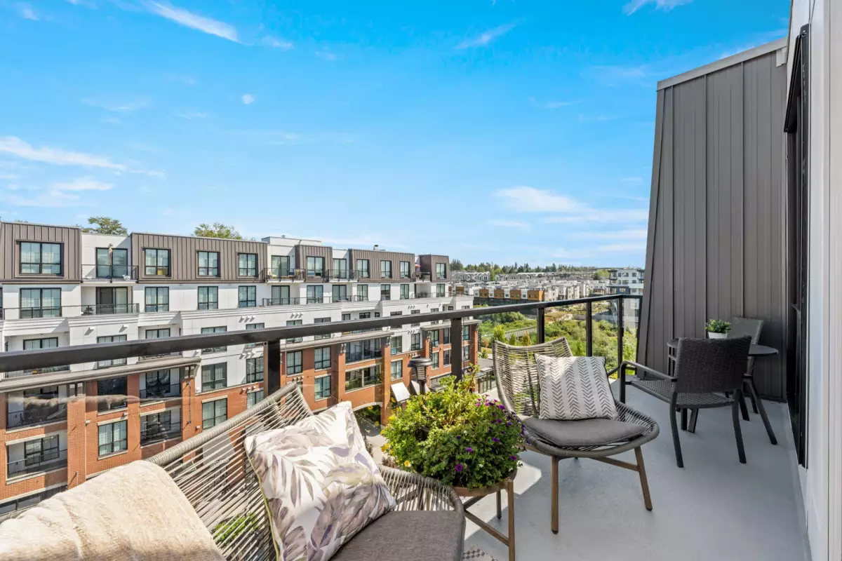Welcome to Latimer Heights! This rarely available 3 + DEN, TOP FLOOR, CORNER UNIT is bright and open with floor-to-ceiling windows! Open kitchen features S/S appliances, gas range, undermount sink, quartz, and eat-up island with loads of storage. 9-foot ceilings and laminate flooring throughout. Living/dining room opens to 1 of 2 balconies! Separate from the living area you will find the den with sliding glass door access to the 2nd, larger balcony. Spacious laundry with plenty of storage. Primary fits a king-size bed with walk-in closet + ensuite with quartz & oversized shower. 2 PARKING + STORAGE. Strata fee includes hot water + gas! Latimer Village is a community packed with restaurants, shopping and minutes to the new Josette Dandurand Elementary, Highway 1, and Carvolth Bus Exchange.
