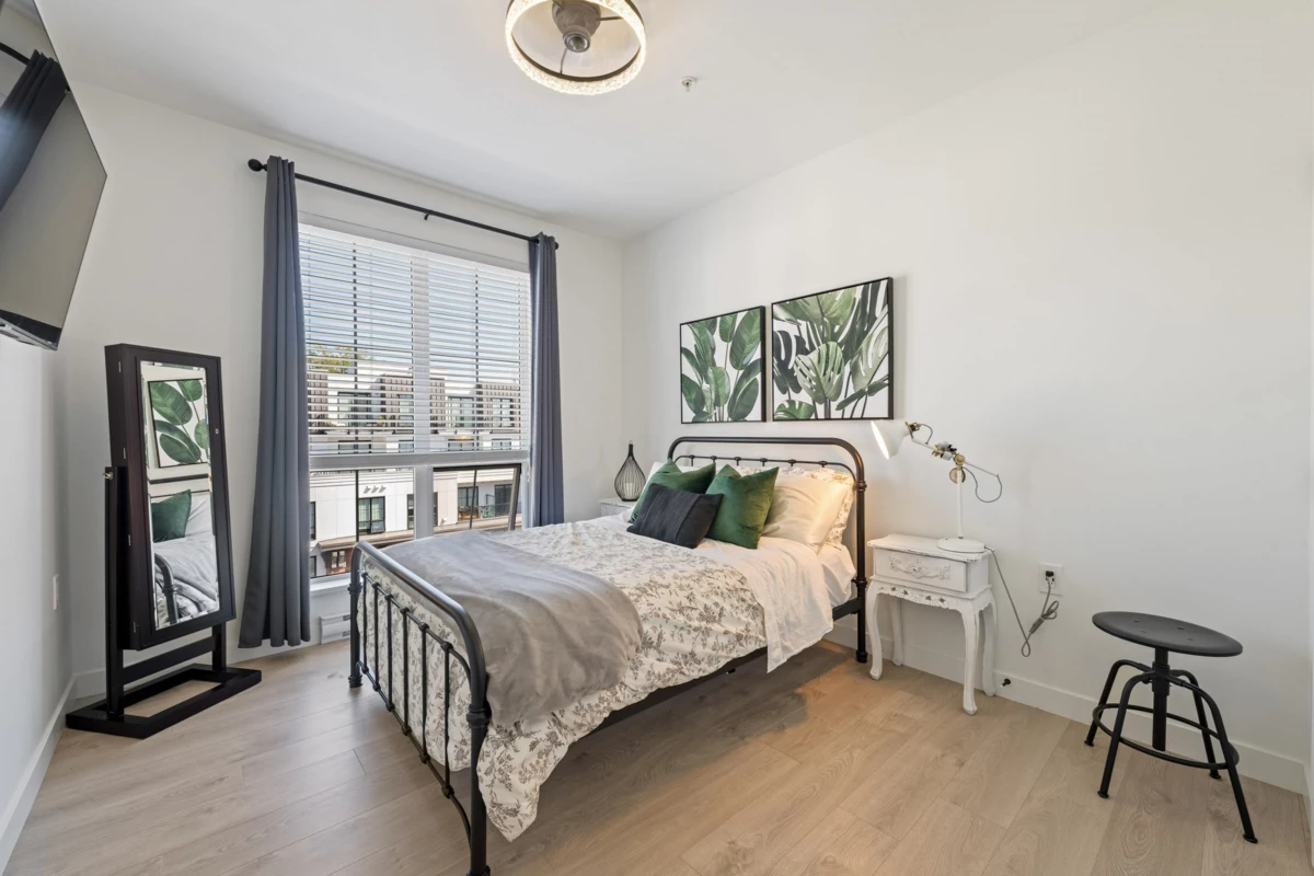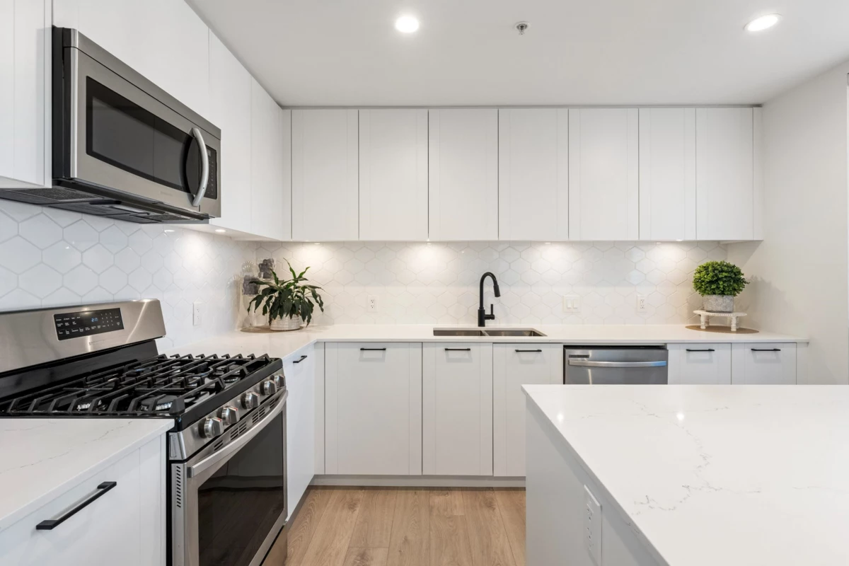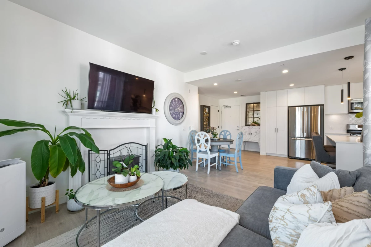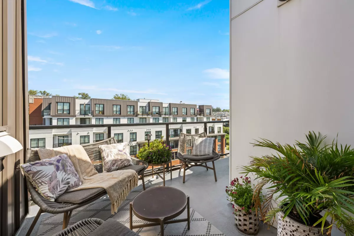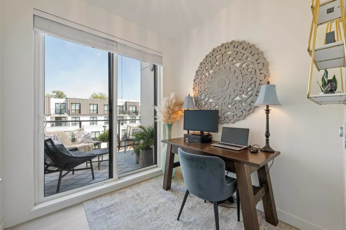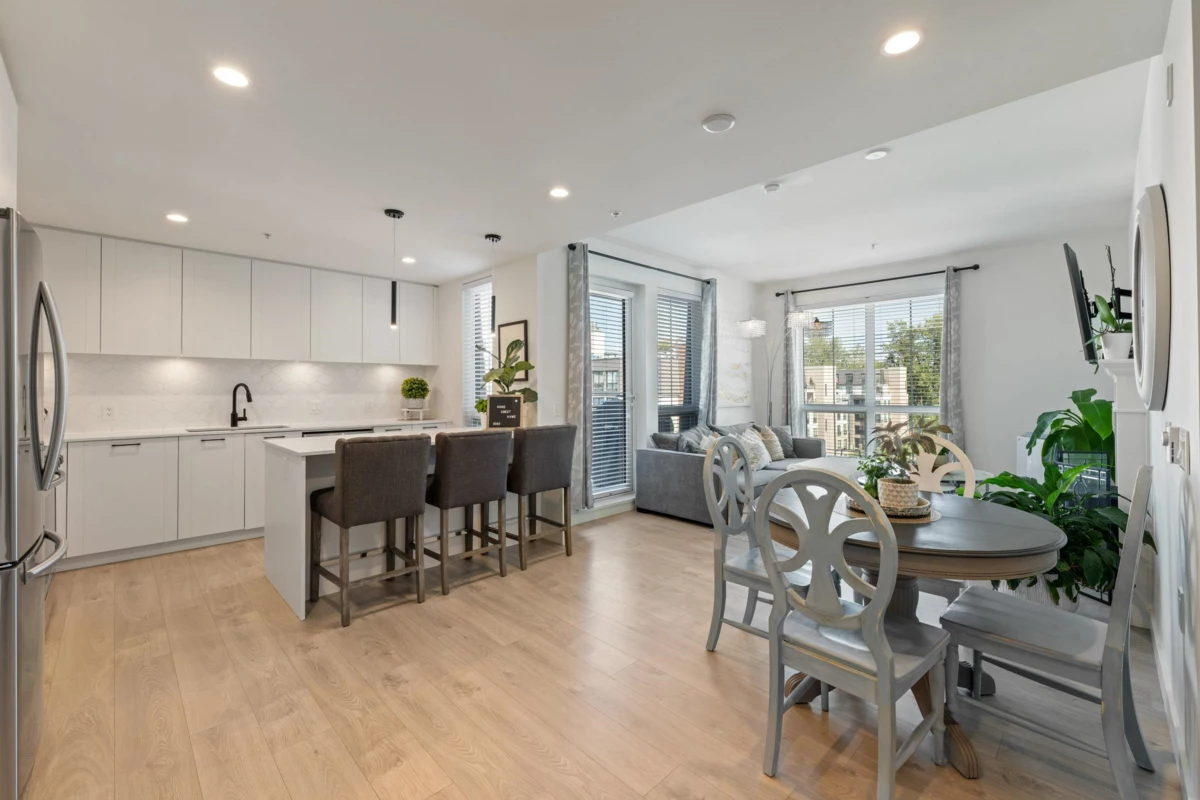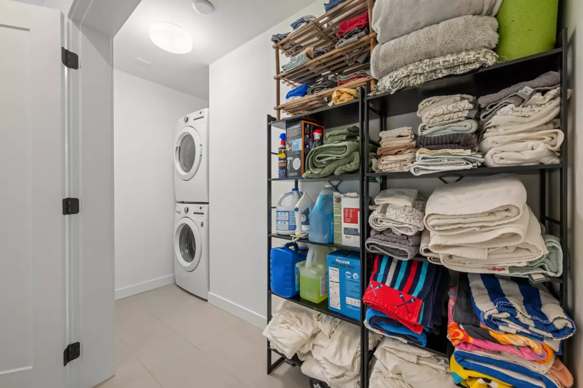 Welcome to Latimer Heights! This rarely available 3 + DEN, TOP FLOOR, CORNER UNIT is bright and open with floor-to-ceiling windows! Open kitchen features S/S appliances, gas range, undermount sink, quartz, and eat-up island with loads of storage. 9-foot ceilings and laminate flooring throughout. Living/dining room opens to 1 of 2 balconies! Separate from the living area you will find the den with sliding glass door access to the 2nd, larger balcony. Spacious laundry with plenty of storage. Primary fits a king-size bed with walk-in closet + ensuite with quartz & oversized shower. 2 PARKING + STORAGE. Strata fee includes hot water + gas! Latimer Village is a community packed with restaurants, shopping and minutes to the new Josette Dandurand Elementary, Highway 1, and Carvolth Bus Exchange.