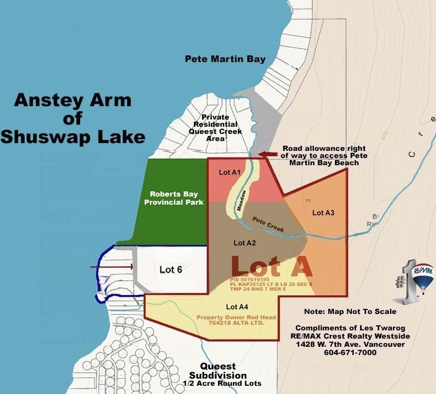 Rare opportunity to own 223 acres on the east side of Anstey Arm, Shuswap Lake, in North Queest, Sicamous, BC. This exceptional offering includes two titles sold together: Lot A (190.06 acres, with road access) and Lot 6 (33 acres, water access only). Surrounded by the pristine natural beauty of Anstey Arm, these properties offer a remarkable combination of waterfront and upland terrain, providing direct access to Roberts Bay Provincial Park and close proximity to Pete Martin Bay.