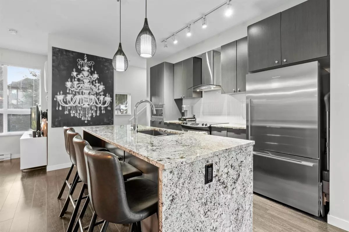 Desirable Mason & Green townhome built by Polygon Homes in sought-after Willoughby Heights. Includes 2 bedrooms, 2.5 washrooms, and a well-appointed and generously sized open-concept layout with a wide main floor and double garage. The contemporary kitchen features quartz countertops with waterfall island and built-in microwave. Great location in the complex with one of the largest fenced yards and directly facing the playground and convenient visitor parking near the unit. Spacious primary bedroom accommodates a king-size bed and full furnishings, complete with a large walk-in closet and ensuite with double sinks. Enjoy resort-style amenities including an outdoor pool, fitness centre, theatre room, hot tub, and lounge. Prime location within walking distance to Richard Bulpitt Elementary.