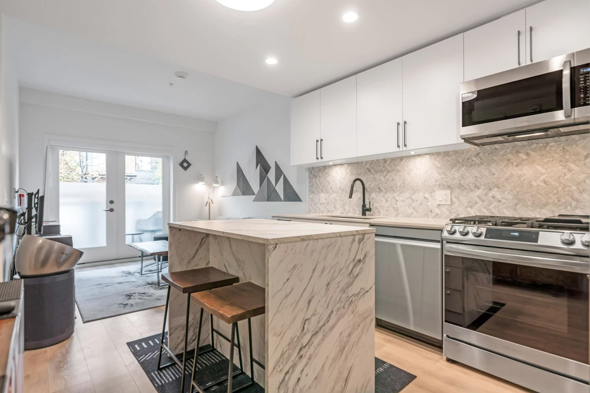 GARDEN-LEVEL END-UNIT at The Trails in Moodyville offering bright, open living and a private fenced patio surrounded by greenery. Wide-plank flooring, high ceilings and large windows create a bright and airy feel throughout. Modern kitchen with gas cooktop, stainless appliances and kitchen island for everyday living and entertaining. Thoughtful bedroom separation provides privacy, while the primary suite features generous closets and a well-finished ensuite. Newer construction with easy transit access across the North Shore and into Vancouver. Steps to the Spirit Trail and minutes to Lower Lonsdale shops, dining and waterfront — a perfect blend of comfort and walkable lifestyle.