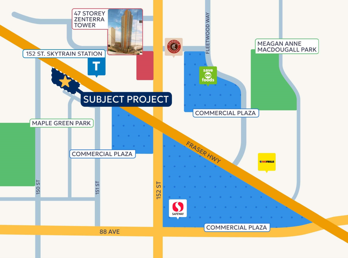 Developer alert! Land assembly! Street front, total 48000+ sqf. Under Surrey Fleetwood Plan, FAR 5, Within 200m TOA, buildable minimum 20 storey with ground commercial (please verify with city by your own diligence). Ongoing 152 St. Skytrain station of Expo line Frazer Highway extension is right across the street. 15028 & 15038 Frazer Hwy & 15053 90A & 15043 90A are for sale too. Highly developing area & great potential.