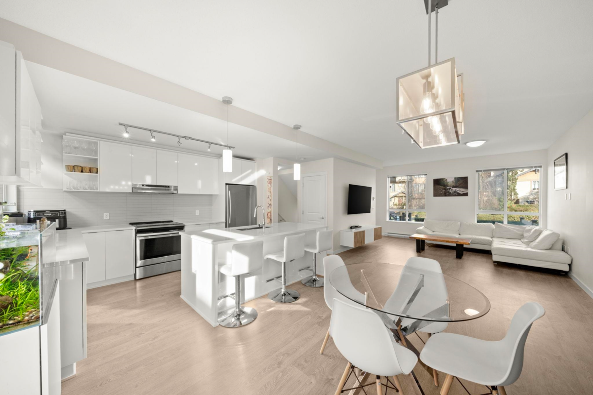 Prestigious Townsend by Polygon! This contemporary 3-storey townhouse offers 3 bedrooms + den and 2.5 bathrooms. The spacious primary bedroom features a spa-inspired ensuite with a large walk-in shower and two walk-in closets. Bright and open-concept living and dining area with 9’ ceilings, creating an airy and welcoming space, complemented by a modern kitchen with stainless steel appliances and quartz countertops. Double side-by-side garage with ample storage space. Access to a 3-storey clubhouse with lounge and party room. Steps to Panorama Village shopping, restaurants, banking, YMCA recreation centre, and nearby schools. A beautifully maintained, like-new home offering modern comfort and style in a family-friendly community.
